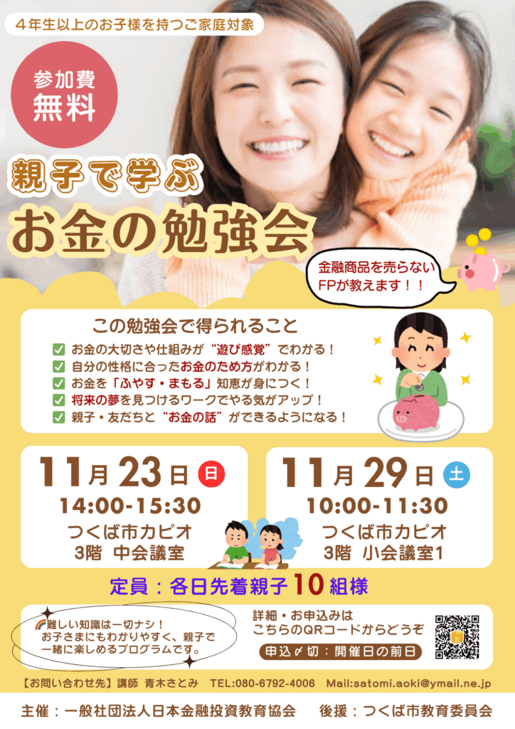 茨城県つくば市教育委員会より後援を受けました~青木さとみ講師「親子で学ぶ お金の勉強会」~